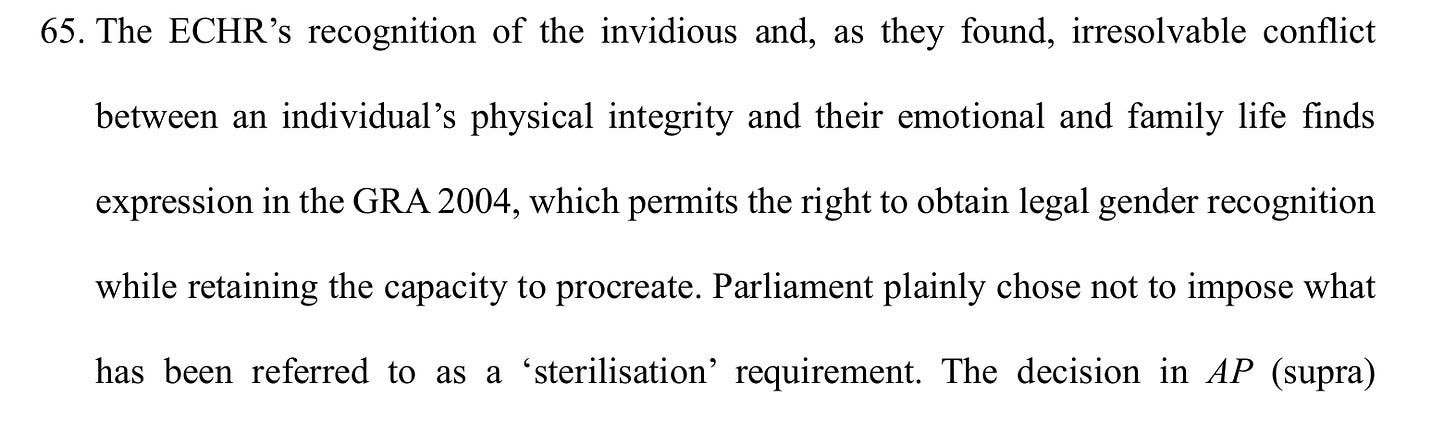 There is instead a long detour about the possibility of there being male mothers and female fathers in accordance to the law, as expressed by the ECtHR and by UK law: