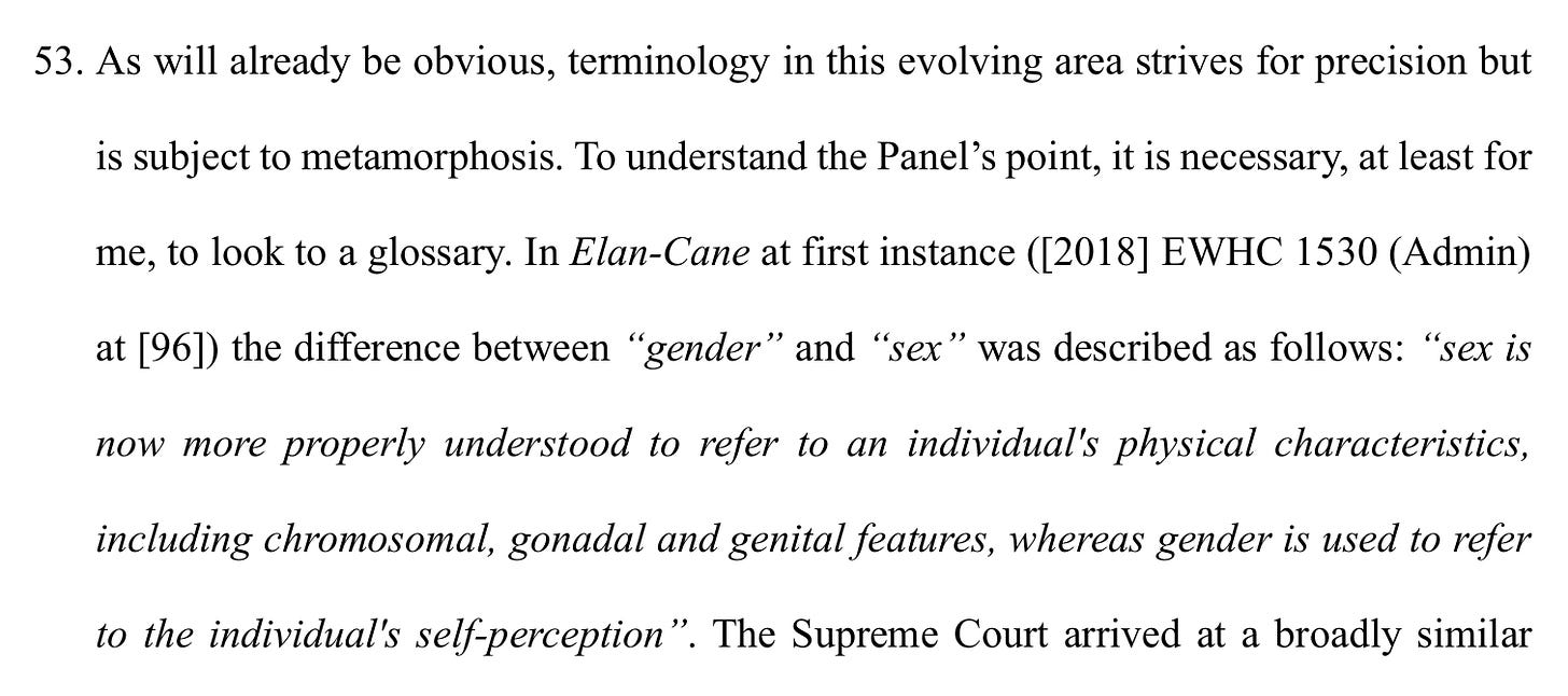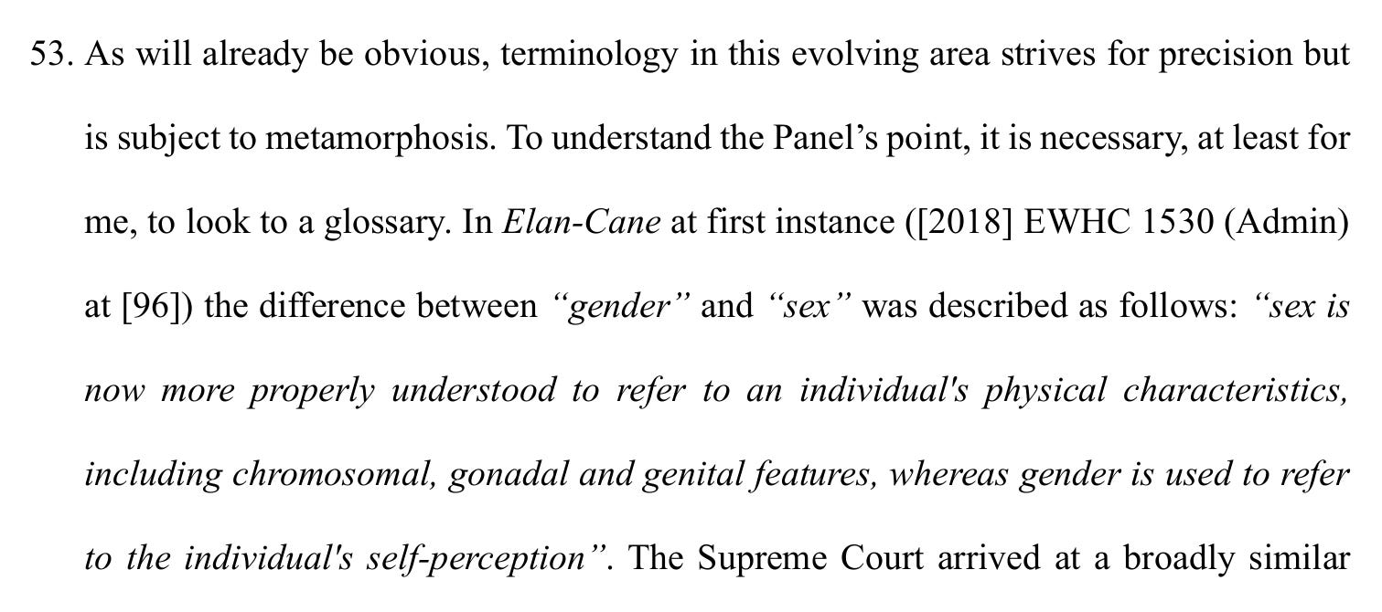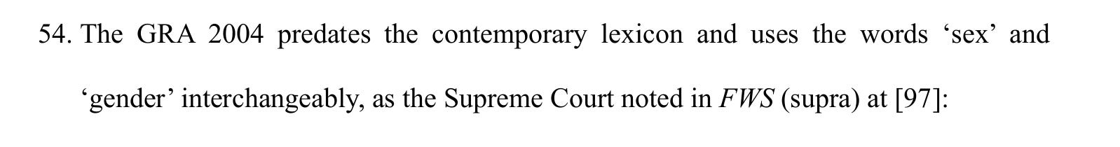 In fact, this is not the case. In the GRA the word sex appears only once, in s9, with reference to the language of birth certificates. Everywhere else the Act uses the word gender, without ever determining its meaning. In any event, while gender can sometimes be used as a euphemism for sex, sex is never used as a substitute for gender, so the two words are not interchangeable, because there is no reciprocity. It is getting tiresome to see judges repeat this mistake over and over again, and to see parroted by legal scholars who present themselves as experts in this area of law (a buon intenditor, poche parole). Finally, it is clear by now that this replacement was not innocent but was engineered specifically to erase sex as a protected category, so really, we can do without these Pollyanna judges refusing to see what is done under their noses while they earnestly talk about her penis and his pregnancy, as if this perversion of reality does not affect their status and the very integrity of the rule of law.