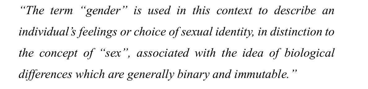 Starting to find this judge’s pretentious language a bit grating. I am sure he meant the language is developing, not undergoing a metamorphosis. It is also not clear whether he correctly identifies the distinction between the cultural and social use of the word gender and its meaning in law, for which a reference to the Istanbul Convention is necessary. In the Convention, at Article 3, gender is defined as follows