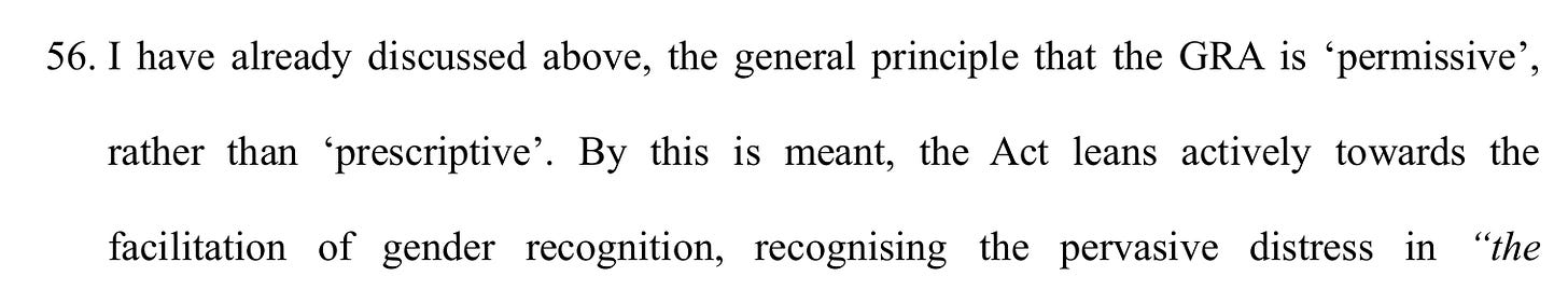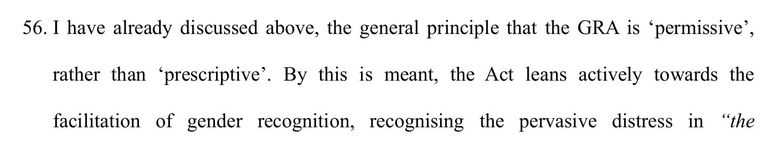 This is not, to my knowledge, the distinction between the terms as it is normally understood in legal theory, which pertains to the distinction between permissive norms, ie norms that permit a certain behaviour, and prescriptive norms, ie norms that dictate a certain behaviour (either positively, dictating that something is done, or negatively, that something is prohibited). I think rather the Judge here intends to draw a distinction between rules being read restrictively or not. I have to say this sloppiness does not inspire confidence, especially because it infects the next section of the judgment, where the Judge tackles the meaning of living in the acquired gender. This is the beginning: